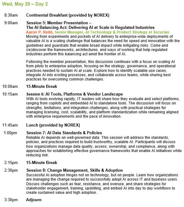 Join IT peers from large enterprise organizations for the IN PERSON NOREX Select workshop, AI in Action – From Strategy to Scale, to discuss deploying, governing, and scaling AI. Space is limited. Registration will be shut off when the max capacity is reached. Through peer discussions, real-world case studies, and practical frameworks, Members will explore strategy, data, governance, and organizational readiness, from early pilots to enterprise-wide adoption, and gain actionable insights to advance AI initiatives more quickly, safely, and effectively. This professionally moderated 2-day event will be hosted by NOREX Member, Securian Financial Group, 401 Robert Street North, St. Paul, MN, on May 19-20, 8:30am-4:00pm. To ensure greater objectivity and honesty, vendors may not sponsor or attend.There are many hotels in the downtown area, here are a few suggestions: DoubleTree by Hilton Hotel St. Paul Downtown, Hyatt Place St. Paul Downtown, and Holiday Inn St. Paul Downtown.