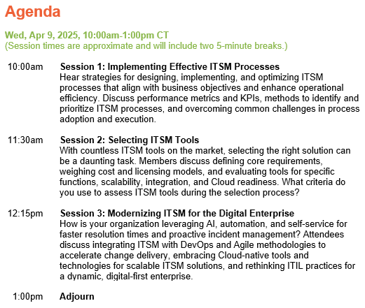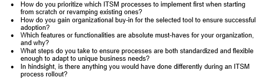 Join IT peers in this 3-hour, professionally moderated session to share strategies and solutions for implementing effective ITSM processes, tool selection, improving service delivery, and modernizing ITSM frameworks and practices. What are the key challenges or gaps in your current ITSM tools that you’re aiming to address?