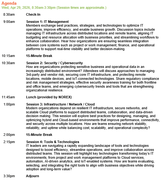 Organizations across industries face evolving IT challenges, from supporting distributed teams and complex initiatives to enabling seamless collaboration across multiple stakeholders. Connect with fellow IT leaders IN PERSON to exchange real-world strategies and solutions during this professionally moderated Roundtable, hosted by NOREX Member Messer Construction Co, 643 West Court Street, Cincinnati, OH on Wed, April 29, 8:30am-3:30pm. To encourage open, objective, and candid discussion, vendors may not sponsor or attend.
