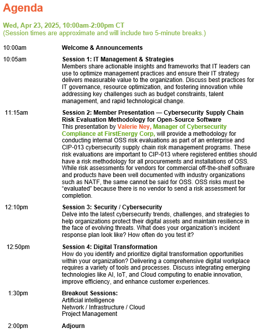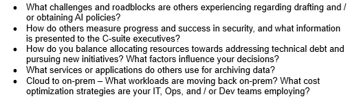 Join IT leaders for this 4-hour, professionally moderated roundtable featuring an insightful Member presentation, breakout sessions, and peer-driven agenda. Exchange strategies and solutions for effective budgeting, governance, cybersecurity, hybrid accommodations, generative AI, and digital transformation. How is your IT organization evolving to meet the needs of the business?