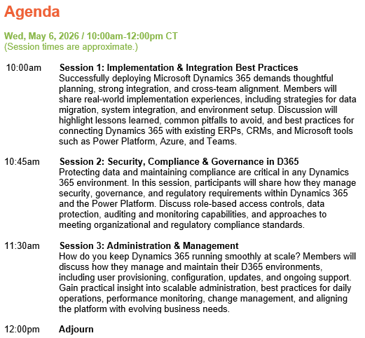 Connect with fellow IT leaders in this 2-hour, professionally moderated Roundtable on optimizing Microsoft Dynamics 365 across the enterprise. Explore best practices for implementation, integration, security, compliance, and scalable administration. Participants will share real-world experiences, lessons learned, and practical strategies to manage data, systems, and access while keeping Dynamics 365 reliable, secure, and aligned with business goals.