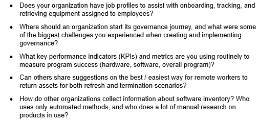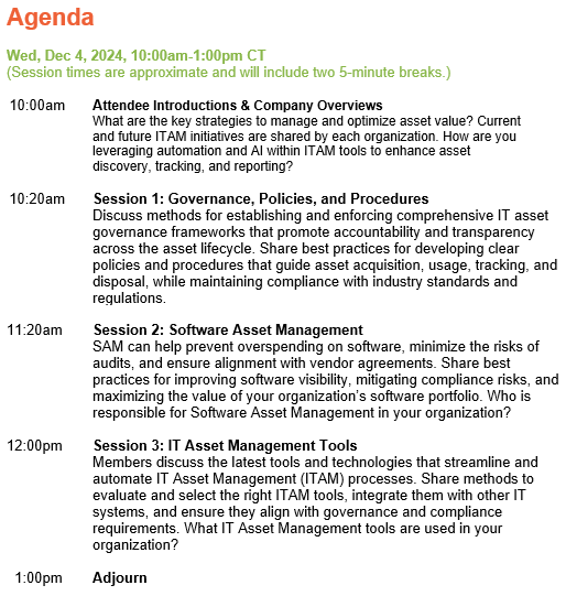 Effective IT Asset Management (ITAM) is essential for organizations to gain control over their technology investments, reduce costs, and ensure compliance. Connect with IT peers from large enterprise organizations in this 3-hour, professionally moderated session to exchange strategies and best practices for managing the entire lifecycle of IT assets, streamline asset tracking, integrate ITAM with other processes like procurement and IT Service Management (ITSM), and leverage automation tools to enhance accuracy and efficiency.