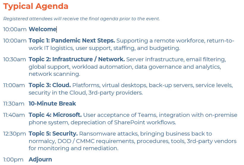 Join your fellow IT leaders to exchange strategies and solutions during this professionally moderated Virtual IT Roundtable to be held via video-conferencing technology on Wed 04/21, 10am-1pm CT (see the tentative agenda below). The engaging discussion occurs simultaneously with a robust chat. To ensure greater objectivity and honesty, vendors may not sponsor or attend.