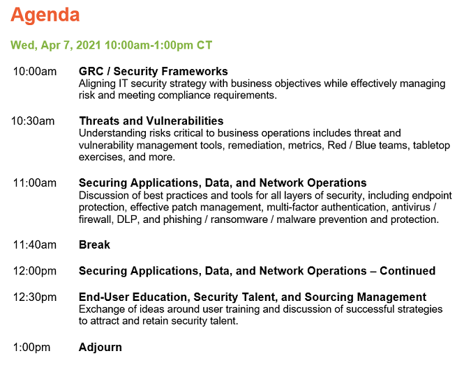 Join your fellow IT leaders to exchange strategies and solutions during this professionally moderated Virtual IT Roundtable to be held via video-conferencing technology on Wed 04/07, 10am-1pm CT. The engaging discussion occurs simultaneously with a robust chat. To ensure greater objectivity and honesty, vendors may not sponsor or attend.
