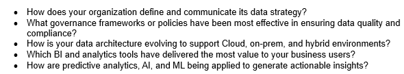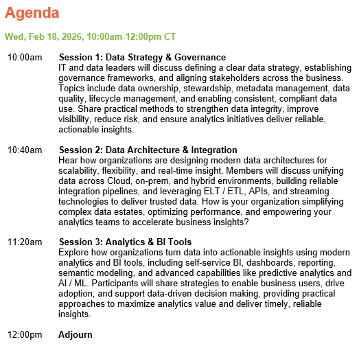 Join IT and data leaders in this two-hour roundtable on maximizing data analytics and BI impact. Explore data strategy and governance, modern architectures and integration, and analytics tools including dashboards, self-service BI, and AI / ML. Share best practices to improve data quality, accelerate insights, and enable data-driven decision making. How is your organization turning data into trusted, actionable intelligence?
