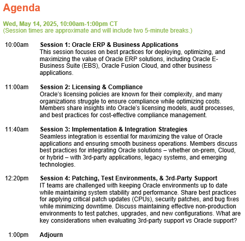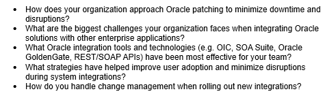 Connect with IT peers in this 3-hour, professionally moderated session to share best practices and challenges regarding Oracle licensing and compliance, Cloud strategy and migration, integrating with other applications, patching, test environments, and 3rd-party support. How does your organization prepare for Oracle audits, and what best practices have you found effective?