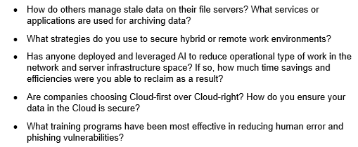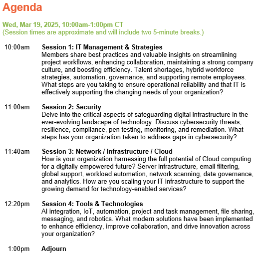 How do you ensure that your IT strategy aligns with the overall business objectives? Join IT peers in this 3-hour, professionally moderated session to discuss strategies and solutions for streamlining project workflows, hybrid accommodations, data management, cybersecurity, IT service delivery, tools, and emerging technologies.