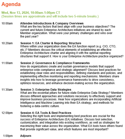 Connect with IT leaders from large enterprise organizations in this 3-hour, professionally moderated session to discuss the evolving role of EA in driving digital transformation, integration of emerging technologies, governance and compliance frameworks, and the alignment of IT and business strategies. How is your Enterprise Architecture practice organized?