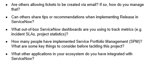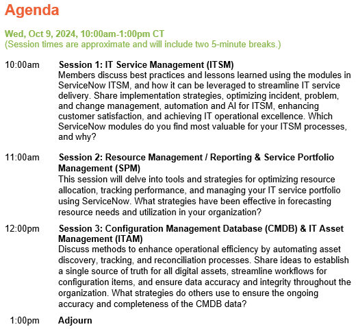 How is your organization leveraging ServiceNow to improve IT operations? Connect with peers from large enterprise organizations in this 3-hour, professionally moderated session to share experiences, benefits, and lessons learned using ServiceNow and the specific functionality within the modules. Discuss ITSM, ITAM, CMDB, implementation partners, emerging trends, and best practices to enhance productivity and drive digital transformation. How have you customized ServiceNow to meet the specific needs of your organization?