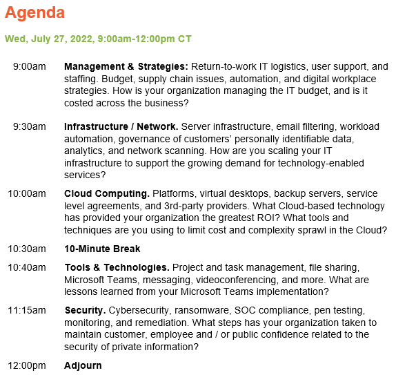 Join fellow IT leaders to exchange strategies and solutions during this professionally moderated Virtual IT Roundtable to be held on Wed 07/27, 9am-12pm CT (10am-1pm ET). The engaging discussion occurs simultaneously with a robust chat. To ensure greater objectivity and honesty, vendors may not sponsor or attend.