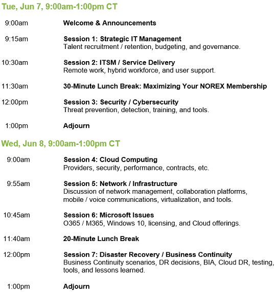 Join fellow IT leaders to exchange strategies and solutions during this 2-day, professionally moderated Virtual IT Roundtable to be held on June 7-8, 9am-1pm CT daily (see the tentative agenda below). This event will feature a powerful peer-driven agenda, insightful peer presentations, and collaboration as NOREX Members and guests openly share solutions for current IT challenges in a vendor-free environment.