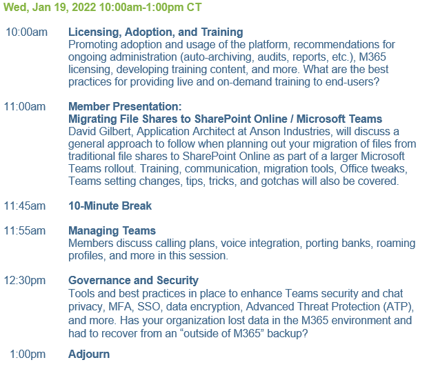 Attend this 3-hour session on Microsoft 365 / Teams for discussion around adoption, management, governance, and more!