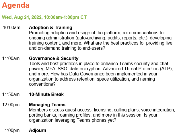 Join fellow IT professionals for this session on Microsoft Teams to share lessons learned and best practices regarding adoption, management, governance, security, and more during this professionally moderated Virtual IT Roundtable to be held on Wed 8/24, 10am-1pm CT. The engaging discussion occurs simultaneously with a robust chat. To ensure greater objectivity and honesty, vendors may not sponsor or attend.